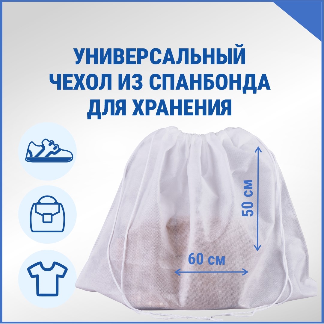 Многоразовый, универсальный чехол из нетканого материала с ультразвуковой спайкой швов. Мешок из спанбонда приятный на ощупь, легкий и компактный.